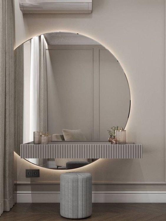 يمكن تصميم المرآة بشكل بسيط، أو نقوش ذهبية، أو بإطار خشب، أو بدون إطار… حسب ذوقك.